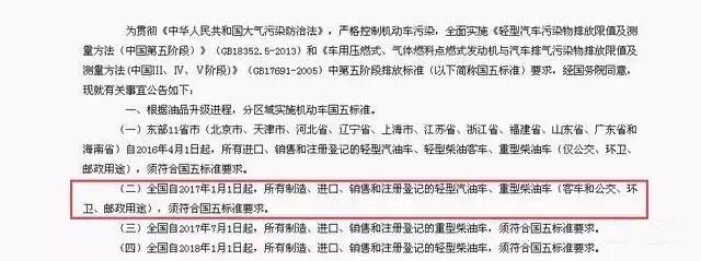 环保部、工信部发布的《关于实施第五阶段机动车排放标准的公告》,自2017年1月1日起,全国所有制造、进口、销售和注册登记的轻型汽油车、重型柴油车(客车和公交、环卫、邮政用途),须符合国五标准要求。