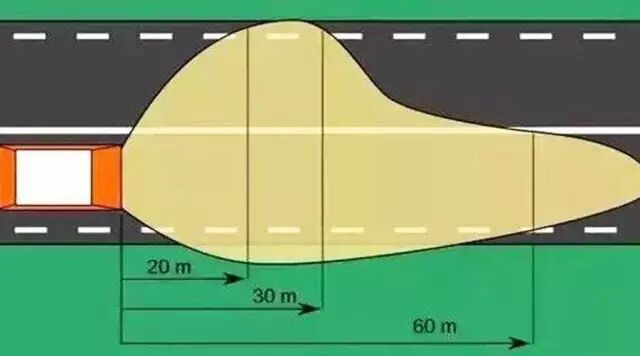 这主要是为了尽可能不影响对向车道来车的驾驶员的视线,尽可能减少光线照到对方,即"防炫目",所以上图灯光左侧在30m以上的部分突然"收窄"。