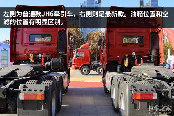 左侧的车是普通版本装配锡柴发动机的JH6牵引车,右侧则是装配潍柴WP13发动机的车型。从后方往前看,你会发现右侧的这辆车相比左侧的车型有两处明显不一样的地方:一、油箱在车身的左侧;二、空气滤清器总成在驾驶室下方。虽然这两个区别已经足够大,但这同样也不是重点。