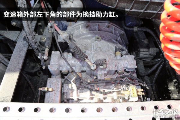 其实这辆JH6和其它车型最大的差异化配置是变速箱,如果仔细观察此款JH6的变速箱,你会发现在控制机构的左下方有一个普通变速箱所没有的部件。没错,它就是换挡助力缸。也就是说,这台JH6装配有气动换挡助力的变速箱。这个配置对于长途驾驶来说可以极大程度降低劳动强度,是一个非常人性化的设计。