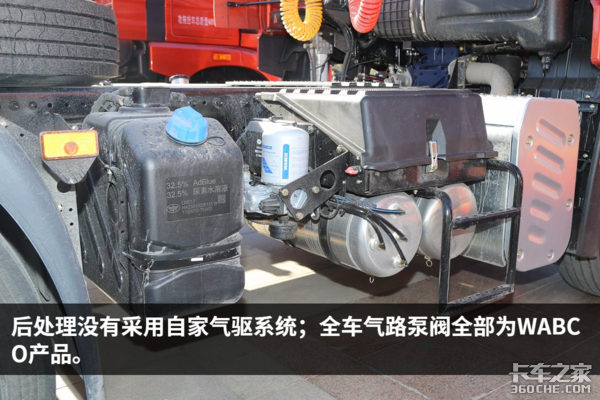 由于搭载的是潍柴的发动机,所以这台JH6没能装配解放自家的气驱SCR,而是采用了常规的SCR后处理系统;除此之外全车的气路干燥器、泵阀也均采用了国际知名大厂WABCO的产品,气制动系统的可靠性还是可以让人放心的。