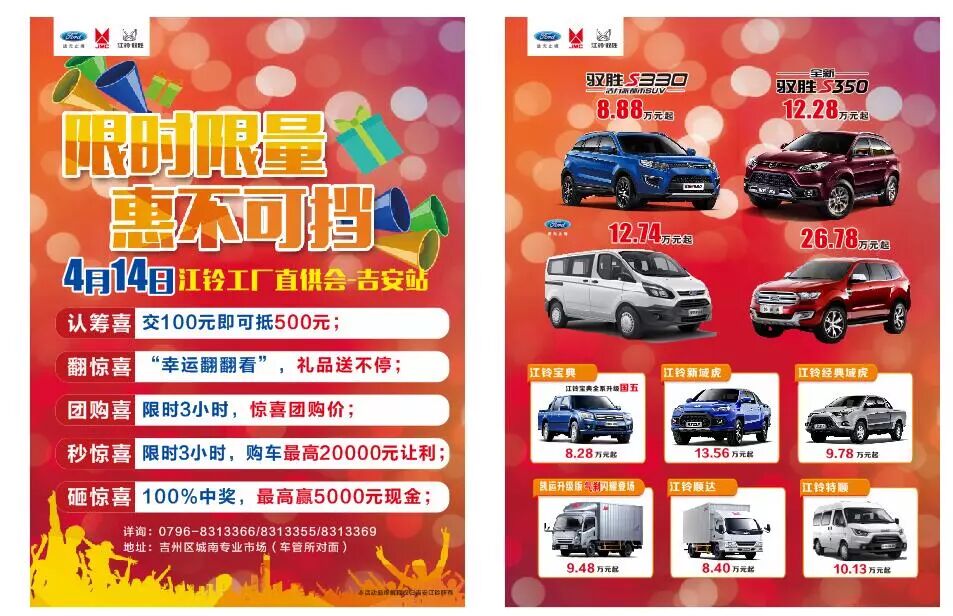 话不多说,更多惊喜,一切尽在本周末的吉安江铃限时限量惠不可挡工厂直供会活动上面哟!