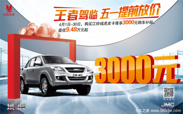 在这草长莺飞的四月天,域虎为你提前放五一价!即日起至4月30日,购买江铃域虎皮卡尊享3000元购车补贴,最低9.48万元起!和域虎来一场说走就走的旅行,正当时。