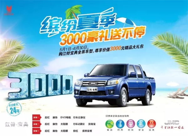 一转眼,今年的三分之一已经过去了。然而,皮卡君发福利的小手却没有停下来的意思!即日起至6月30日,购买江铃宝典全系车型,即可尊享价值3000元精品大礼包!缤纷夏季,皮卡君用大礼包为各位开启!