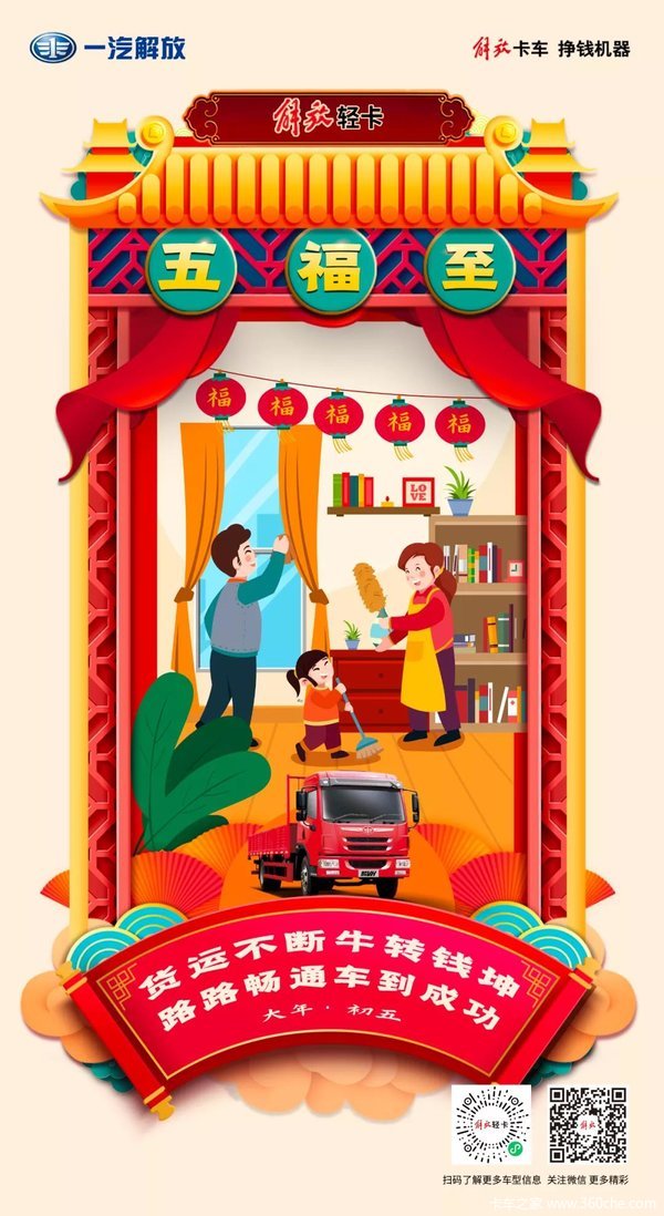 当前位置: 卡车之家 >卡车经销商 > 广西骏宝汽车销售服务(一汽解放轻卡) > 促销新闻 > 初五丨五福至一汽解放广西骏宝祝解放卡友万事胜意