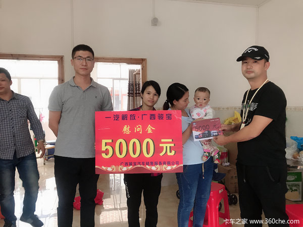 王先生于2017年在广西骏宝汽车销售服务有限公司购买一台解放虎V车型,为了家庭一直在外跑车,累并快乐着,爱人怀胎十月再给家里新添一位小少爷 举家欢庆,而后却发现小朋友先天唇腭裂,顿时忧上心头,开始为治疗奔波。虽然申请了嫣然基金,但是治疗期间的往返路费和生活费对于只有平时跑车收入的他们来说已是一笔不少开支。据王先生爱人描述这次做第一次修复手术已经基本用完他们平时里攒下的积蓄,后期还要做两次修复手术。王先生了解到有骏宝基金后联系到广西骏宝总经理阙豪良说明情况,得知这一情况后,上报厂家,获得一汽解放轻卡厂家大力支持,共同决定向王先生援助5000元的爱心基金,一汽解放轻卡广西省区经理陈涛,广西骏宝公司总经理阙豪良决定前往亲自为他们送去这个福音!微薄之力希望能帮王先生减轻一些负担,同时也希望小朋友早日恢复!