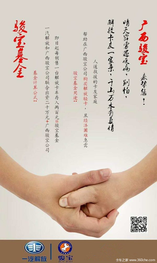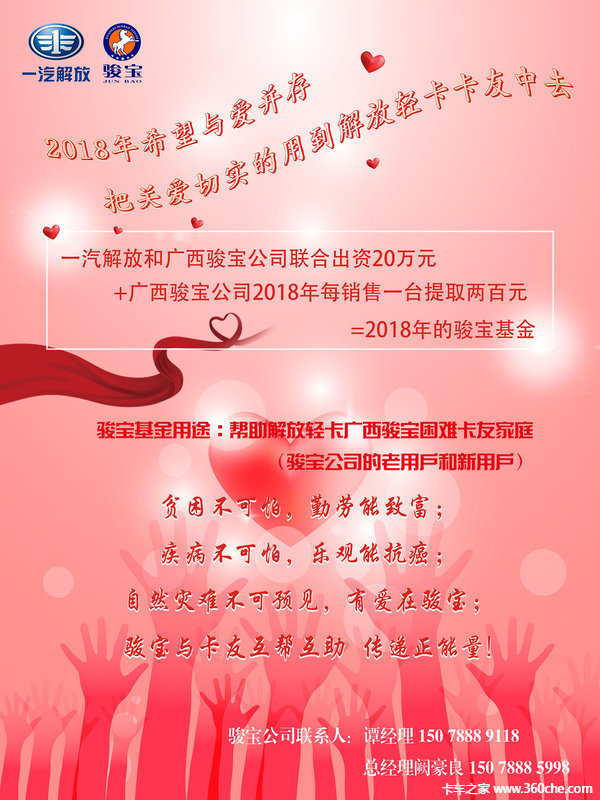 广西骏宝汽车销售服务有限公司一直是一家有爱心,有社会责任感的企业,一直秉承销售品质最优秀的车子,提供最好的售后服务,像家人一样关爱每一位卡友的理念。据悉,广西骏宝向总公司申请了10万元、骏宝总经理阙豪良再拿出10万元,加上广西骏宝从1月起每卖一台车抽出的2百元骏宝基金,对曾经或者最新买过解放轻卡中的用户,由于大病、车祸、孩子上学等一些原因,造成家庭困难的卡友,尽他们一点微薄之力,无偿捐助一部分钱给这些困难家庭的卡友兄弟们,有这些情况的,可以直接联系骏宝公司。