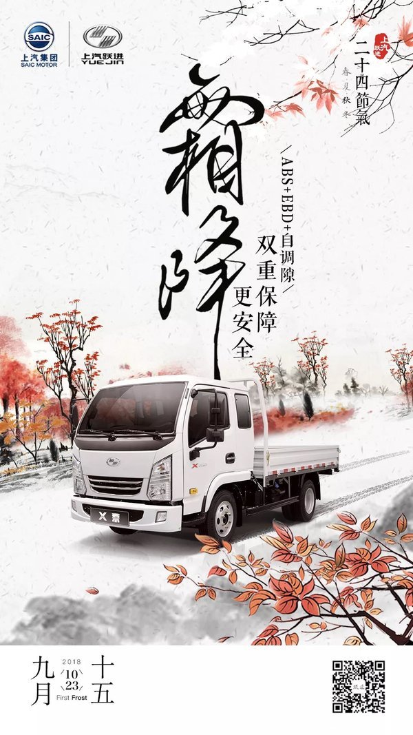 霜降——秋天最后一个节气,霜降过后就正式入冬了。霜降已至,路面行驶谨防侧滑。上汽跃进X系配备了ABS+EBD+自调隙双重保障,为您的安全出行保驾护航!