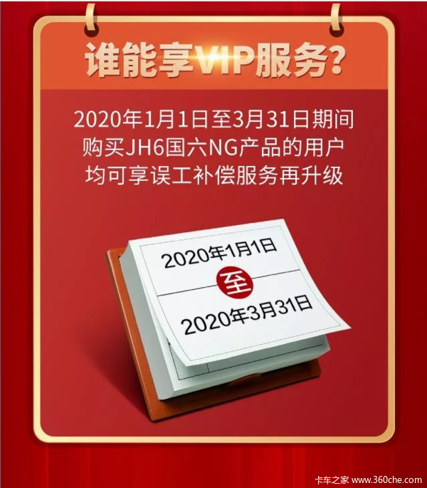 当前位置: 卡车之家 >卡车经销商 > 安徽天汇汽车销售服务(青岛解放) > 促销新闻 > 【VIP专享】JH6国六NG服务再升级,误工每天补偿1600元!