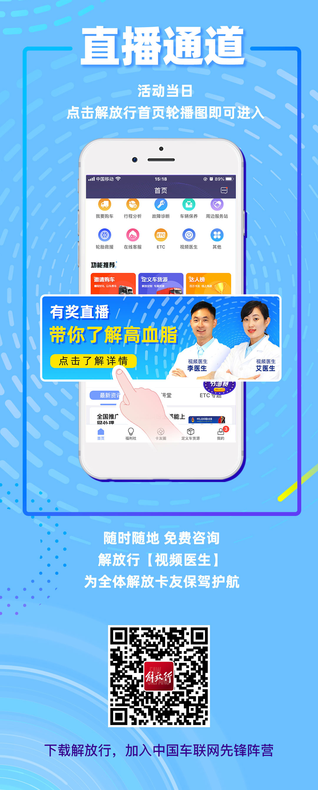 当前位置: 卡车之家 >卡车经销商 > 安徽天汇汽车销售服务(青岛解放) > 促销新闻 > 上 解 放 行 看直播,聊健康送大奖