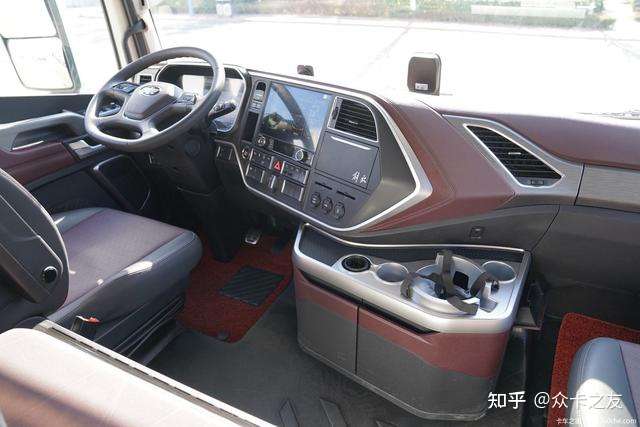 来到商务舱的驾驶室内,整个的造型还是很有解放味道的,整个驾驶室采用的是平地板驾驶室,车内空间非常宽裕,卡友在车内的活动也非常便利。据介绍,鹰途商务舱的驾驶室内空间达到了5平方米,在高端重卡阵营里算是比较出色的了!另外丰富的内设配色以及大面积的哑光金属质感的装饰条点缀,在视觉上颇显高级。同时整个中控面板采用了大面积的软包覆盖,加上双缝线处理,整个车的豪华氛围营造得极为到位。