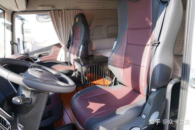 来到驾驶室,整个中控台的造型以及用料没有区别,不过在一些细节方面做了调整,例如商务舱采用的绒布地板在头等舱里换成了类似于仿木地板的设计,整体档次感会显得更高级,同时也方便日常打扫和清理。座椅则是采用型号为MSG115的格拉默高端座椅,提升卡友日常驾车的舒适性,减少长时间驾车带来的疲劳感。