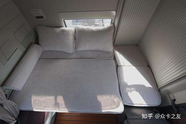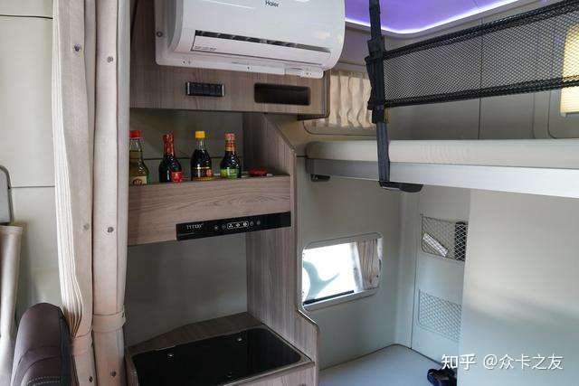 在驾驶区,生活舱依旧延续了头等舱的设计样式,其中包含中控台造型以及仿木地板的搭配,而其最为重要也是最能体现生活舱价值的部分仍然是位于驾驶室后方的休息生活区。