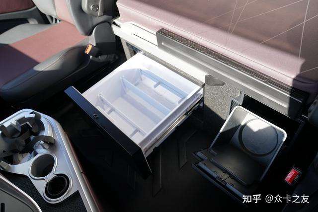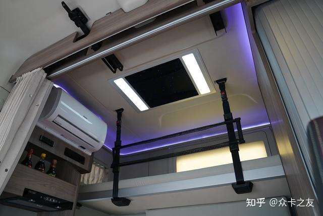 生活舱的休息区设计是更显豪华,车顶四周搭配的紫色氛围灯映衬的车内更加温馨,很有家里的味道。其采用的是上下双卧设计,床垫尺寸比商务舱更大、更厚实,日常休息其舒适感会更好。其中车载空调的样式也是和家里常用的挂机空调没啥区别,相比传统车载空调,其制冷效果会更高,降温速度会更快。