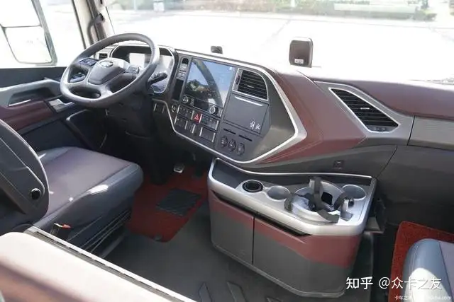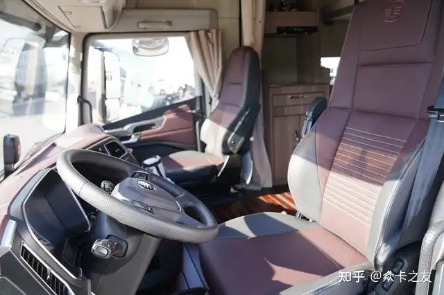 来到驾驶室,整个中控台的造型以及用料没有区别,不过在一些细节方面做了调整,例如商务舱采用的绒布地板在头等舱里换成了类似于仿木地板的设计,整体档次感会显得更高级,同时也方便日常打扫和清理。座椅则是采用型号为MSG115的格拉默高端座椅,提升卡友日常驾车的舒适性,减少长时间驾车带来的疲劳感。