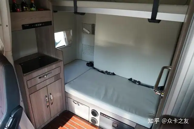 在驾驶区,生活舱依旧延续了头等舱的设计样式,其中包含中控台造型以及仿木地板的搭配,而其最为重要也是最能体现生活舱价值的部分仍然是位于驾驶室后方的休息生活区。
