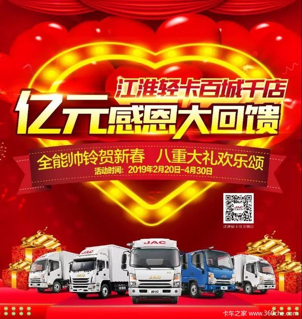 2018年江淮轻型商用车销量突破20万辆,稳居中国中高端轻卡第一品牌,轻卡出口连续17年全国领先。为答谢300万江淮轻卡客户一直以来的信赖,在活动期间,江淮汽车八亿感恩大回馈,八重大礼欢乐颂!