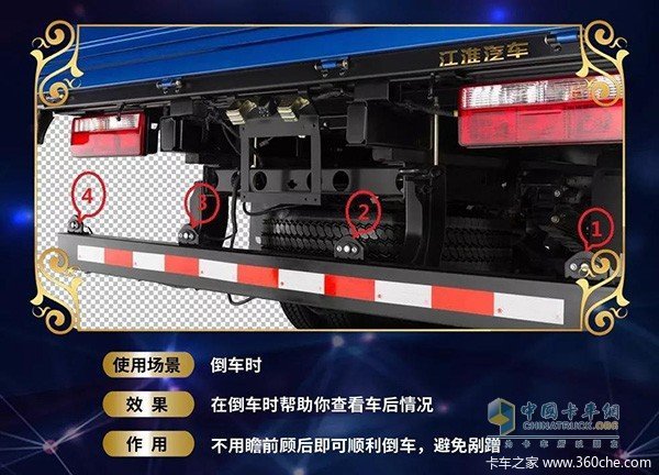 ??江淮轻卡的安全细节,除倒车雷达之外,还配备倒车影像系统。将车后状况清晰显示于中控屏上,随后可准确掌握后方路况,让倒车如前进般自如。此“卡牌”还可用于各时段,即使在夜晚,也能通过配有照明的倒车雷达,将路况看清。