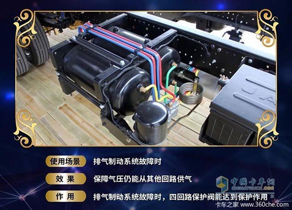??稳定的刹车系统是安全保障的第一要素,此时,如果排气制动系统出现故障,四回路保护阀将会登场,保障当某一回路发生故障,气压仍能从其他回路供气,从而达到多重保护的作用。四回路保护阀正是江淮轻卡安全细节底牌!