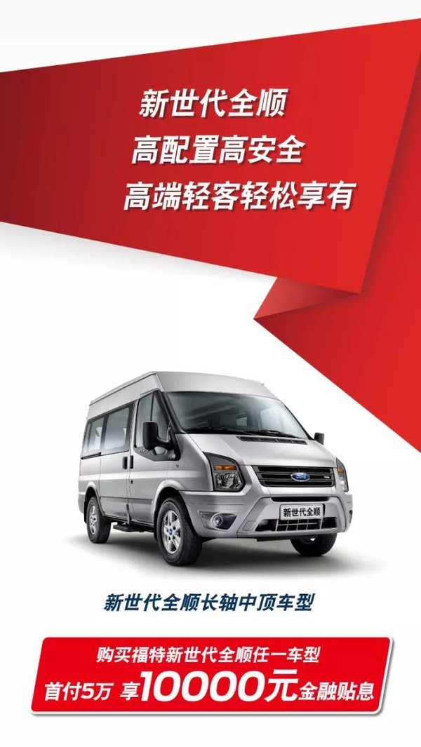 福特新世代全顺让轻客不再只是一台交通工具,其灵活多变的用途更是成就了生活的无限可能。如此欧系魅力,心动不如行动。抓住5月钜惠的尾巴,将这款成就非凡的爱车“贷”回家吧!