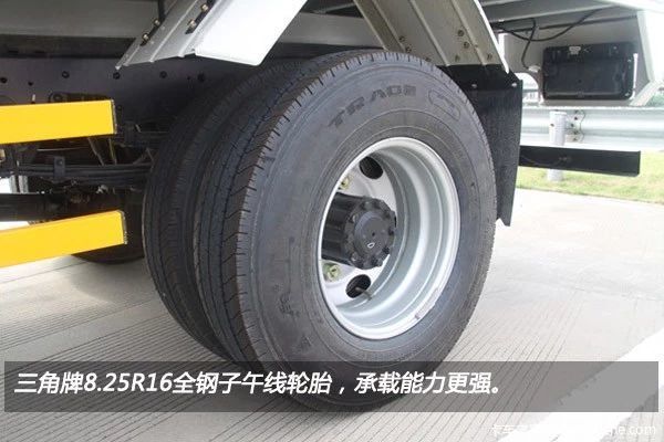 7.5吨车型轮胎规格为7.5R16,8.8吨车型为8.25R16,均为全钢带内胎轮胎,耐用放心。