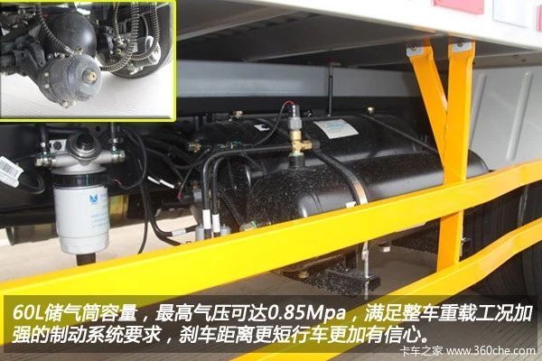 气刹标配ABS 2.0系统,拥有60L储气筒容量,最高气压可达0.85Mpa,满足整车重载工况加强的制动系统要求。而且还有更大的凸轮传动比(125:24/125:20)和制动鼓尺寸(320mm)。刹车距离更短,制动性能更稳,行车更加安全放心。