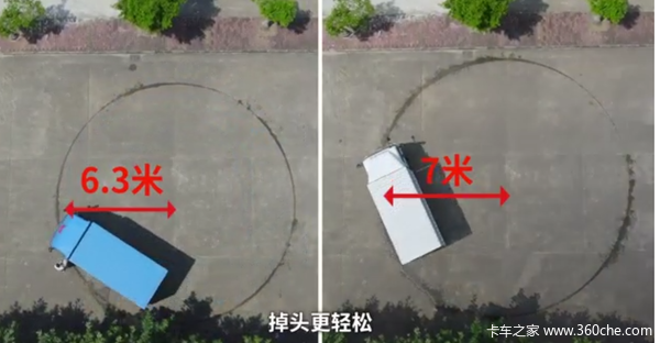 凯运+转弯半径实测6.3米,KV100转弯半径实测7米,凯运+转弯半径更小,四车道一把掉头掉头更轻松。