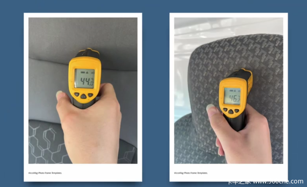 空调快速降温能力对比,同样情况下,凯运+10分钟内主驾头枕温度为44度,而KV100为46.2度,凯运+要低2.2度。