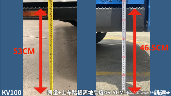 轻卡上车踏板离地越低,上车就更轻松,凯运+上车踏板离地高度46.5CM,而KV100的踏板高度为52.5CM。