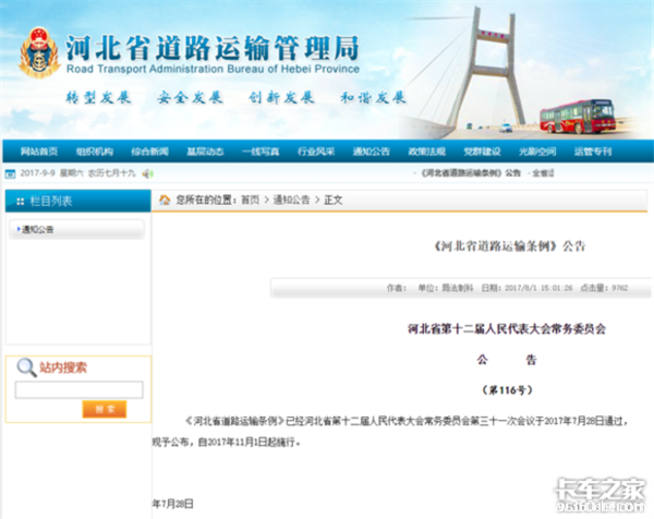 近日,河北省道路运输管理局公布了《河北省道路运输条例》(以下简称条例),公告中表示《河北省道路运输条例》已经河北省第十二届人民代表大会常务委员会第三十一次会议于2017年7月28日通过,现予公布,自2017年11月1日起施行。