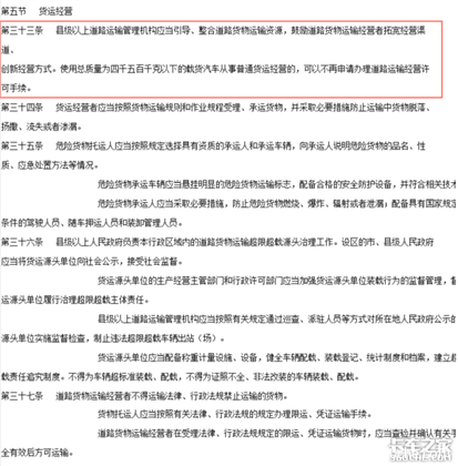 其中条例的第五节关于货运经营的部分明确表示县级以上道路运输管理机构应当引导、整合道路货物运输资源,鼓励道路货物运输经营者拓宽经营渠道、创新经营方式。使用总质量为四千五百千克以下的载货汽车从事普通货运经营的,可以不再申请办理道路运输经营许可手续。