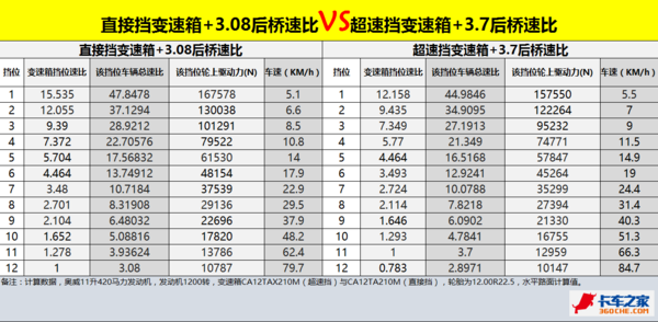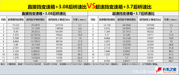 我们以3.7后桥速比配12挡超速挡变速箱与3.08后桥速比配12挡直接挡变速箱的两个车做下对比,大家可以通过下面的表格做具体看看同挡位下两个变速箱的速比、车辆总速比等信息。