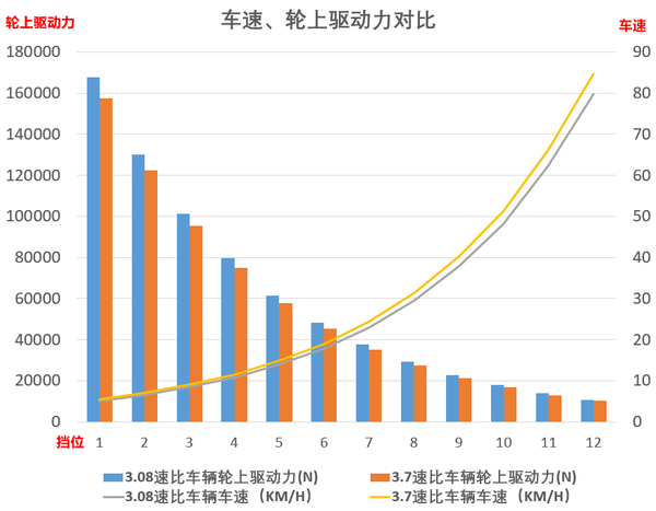 先问大家一个问题,两辆车,一辆3.7后桥速比配12挡超速挡变速箱,另一辆3.08后桥速比配12挡直接挡,发动机、轮胎等其他配置都一样,哪个配置跑的快?哪个配置爬坡有劲?