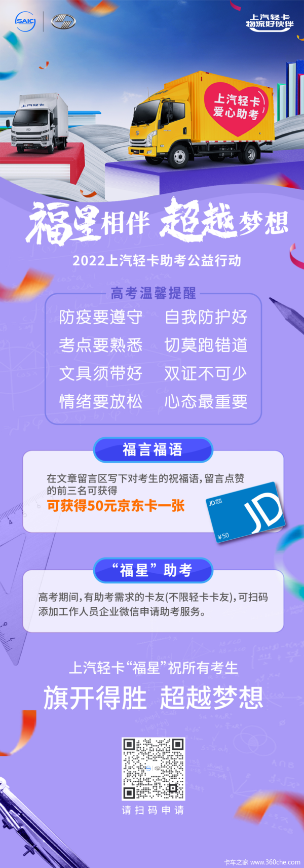 当前位置: 卡车之家 >卡车经销商 > 邢台易松汽车销售 > 促销新闻 > 福星相伴 超越梦想 | 2022 上汽轻卡 助考公益在行动