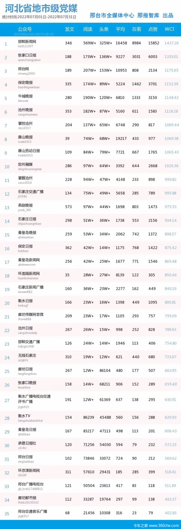 2022年7月,榜单收录的35个河北省地市级党媒微信公众号,总共发文7483,7701篇,比上月减少218篇,总阅读数2619W+,比上月减少183W+,整体略有下降;头条总阅读数为1618W+,比上月减少103W+。10W+文章共9篇,比上月减少1篇。7月份整体发文数、阅读数均有所下降,已连续3个月呈现下降趋势。
