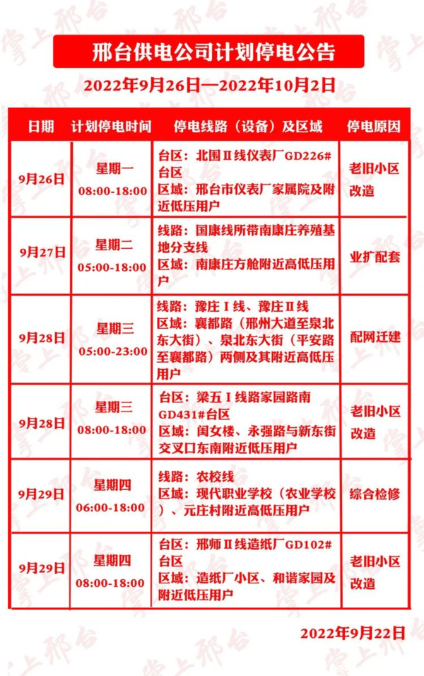 从邢台供电公司获悉,9月26日至29日,邢台部分区域将计划停电,具体时间和大致位置如下: