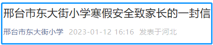 根据邢台市教育局发布的通知,义务教育阶段学校寒假时间:2023年1月13日(农历腊月二十二)至2023年2月5日(农历正月十五),2月6日(农历正月十六)正式开学