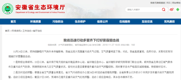 自11月24日以来,受持续静稳天气和外来传输影响,安徽省出现大范围重污染天气过程,空气质量明显下降。对此,安徽省高度重视,迅即行动,采取切实有效措施打好雾霾狙击战。