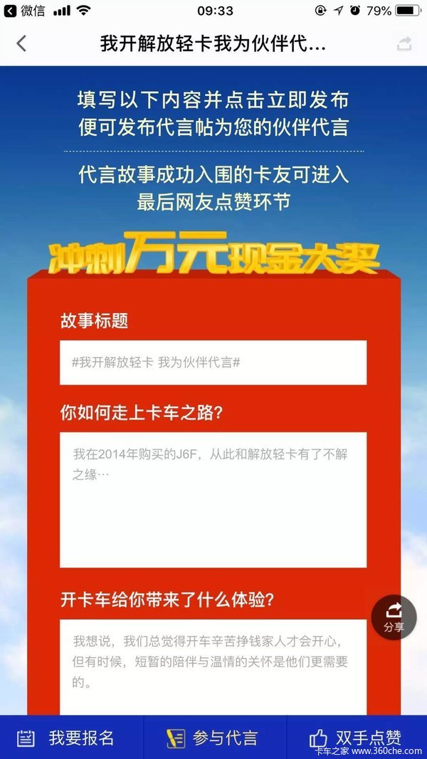 3.报名成功,进入“参与代言”页面,填写标题,写下与卡车之间的故事和感悟(2000字以内)。至少上传一张大小不超过8M的照片,点击“立即发布”。