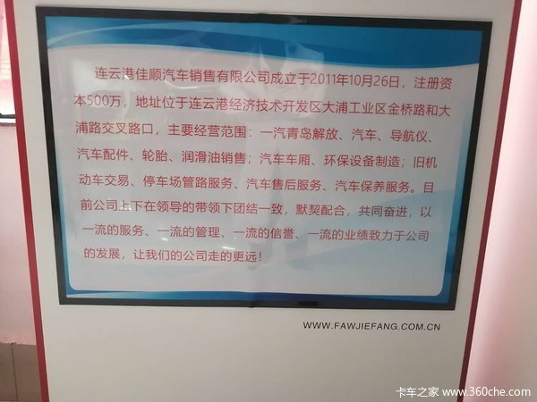 连云港佳顺为青岛解放连云港市一级代理商,主营青岛解放JH6、天V、悍V、龙V。牵引车、自卸车、载货车。连云港佳顺汽车销售有限公司成立于2011年10月26日,注册资本500万,地址位于连云港经济技术开发区大浦工业区金桥路和大浦路交叉路口,主要经营范围:一汽青岛解放、汽车、导航仪、汽车配件、轮胎、润滑油销售;汽车车厢、环保设备制造;旧机动车交易、停车场管路服务、汽车售后服务、汽车保养服务。目前公司上下在领导的带领下团结一致,默契配合,共同奋进,以一流的服务、一流的管理、一流的信誉、一流的业绩致力于公司的发展,让我们的公司走的更远。