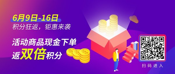 6月9日-16日,积分狂返,钜惠来袭,现金商品下单返双倍积分,买多少返多少,不限量。