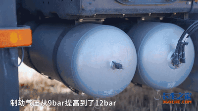 在试驾时曾多次不间断的踩下制动踏板,发现车辆的制动力并没有衰减,原因在于试驾车增加了储气量,并且整车制动气压从原来的9bar提高到了12bar,这能够保证多次制动都有充足的气压支持制动,而大储气量也更加适合很多挂车的气囊悬挂使用需求。