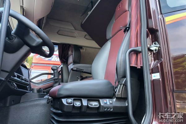 舒适性方面,除了标配四点式气囊悬浮驾驶室之外,3.0版的J6P还配备了来自伊思灵华泰的气囊减震座椅,并且座椅采用了呼应外观的波尔多红,座椅采用皮质材质,同样也是高级感十足。