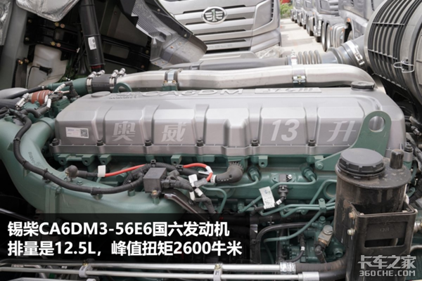 之前我们有提到,可靠性最直观的体现就是在动力链上,这款解放J7搭载的是锡柴CA6DM3-56E6国六发动机,排量是12.5L,发动机在1100-1300r/min时,就可以爆发2600牛米的峰值扭矩,排放标准达到了国六要求。