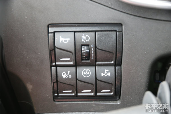 转向柱左侧布置有两排按键,主要是喇叭转换、大灯高度调节、驾驶室翻转开关、取力器等控制按键。