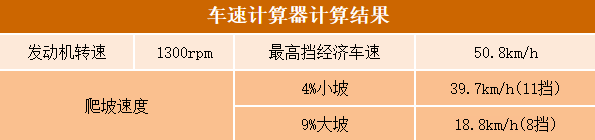 根据发动机转速、变速箱最高挡速比、后桥速比和轮胎型号,通过卡车之家车速计算器可得出,这款车在1300转的经济转速时,经济车速为50.8km/h。从上图车速计算器计算结果来看,这款车的爬坡能力也是值得点赞的。