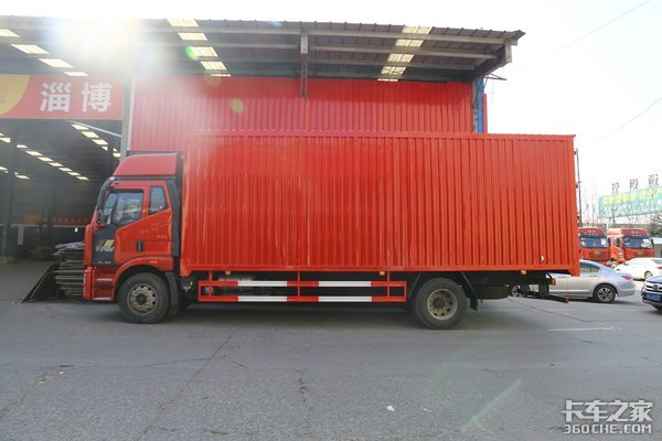 实拍车的上装为厢式货箱,规格为7700x2500x2800mm,有需要的卡友可以选择6米8的仓栏式或是厢式货箱,完全看个人需求。