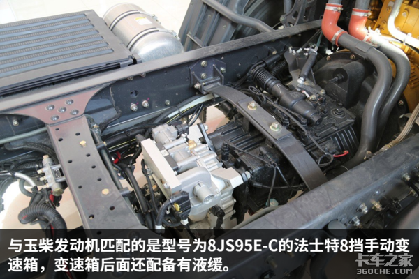与玉柴发动机匹配的是型号为8JS95E-C的法士特8挡手动变速箱,最高挡为超速挡,最高挡速比为0.79。与法士特变速箱相连的是法士特液缓,法士特液缓同样有两种挡位,分别是恒速挡和制动挡。
