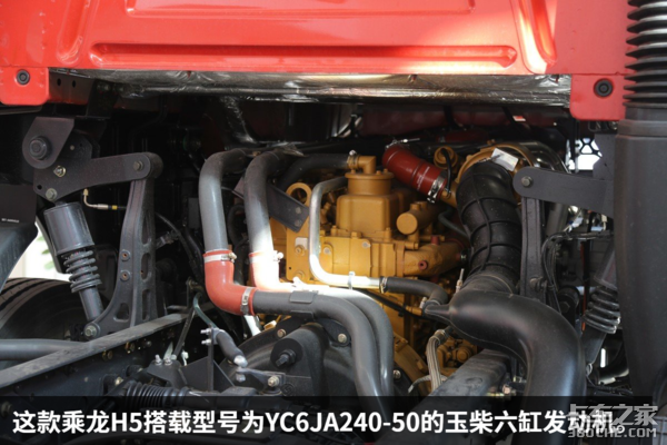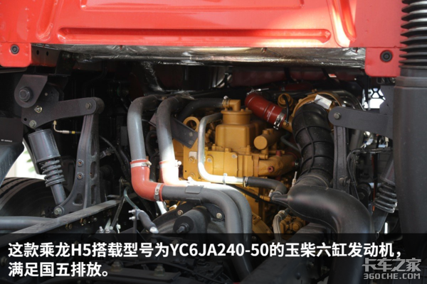 这款乘龙H5搭载型号为YC6JA240-50的玉柴六缸发动机,排量为6.87L,满足国五排放,最大输出为240马力,在1200-1800转的转速区间内可以爆发出950牛米的峰值扭矩。