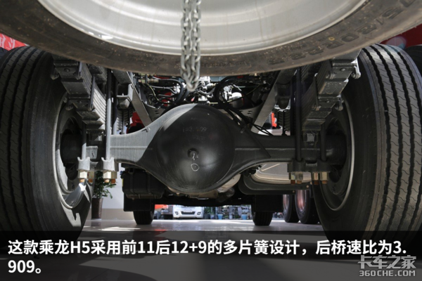 车桥方面,这款乘龙H5匹配的是前3.6T后9T的车桥,配合上前11后12 9的多片簧设计,车辆整体的承载能力非常出色,后桥速比为3.909。